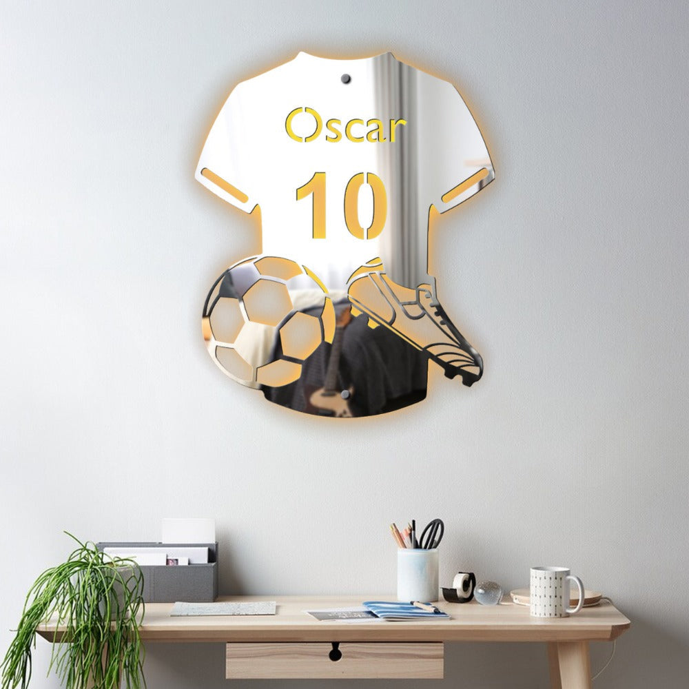 Ge ditt barn en verkligt betydelsefull gåva! Den personliga fotbollsspelar-LED-spegeln sprider kärlek och motivation varje gång de ser sitt eget namn och nummer på tröjan. De färgskiftande ljusen skapar en magisk stämning och fyller barnrummet med uppmuntran, vilket inspirerar dem att fortsätta drömma stort. Lätt att montera och skräddarsy efter deras unika stil – den här spegeln kommer garanterat att bli en omedelbar succé bland både vänner och familj!